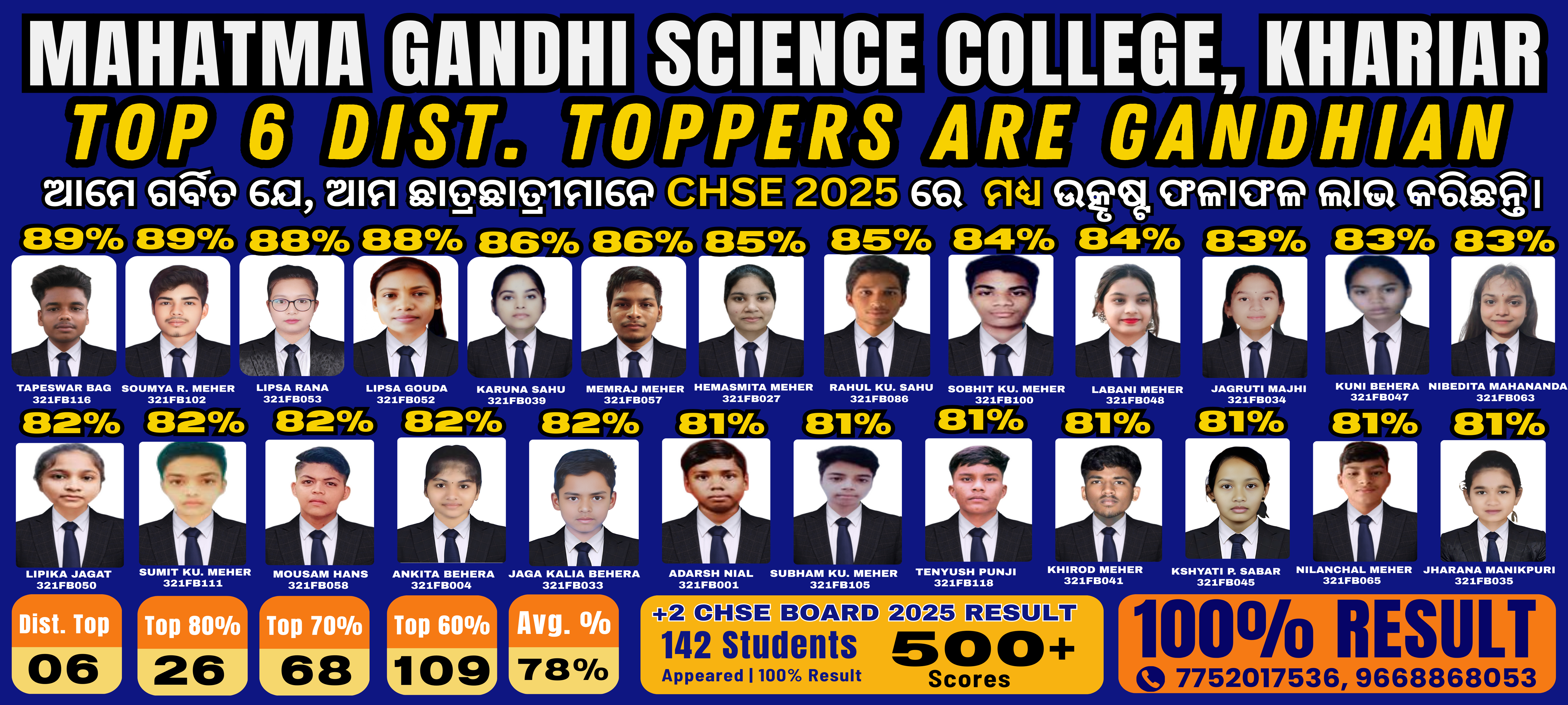 Mahatma Gandhi College, Khariar provides good quality, modern education, including a strong component of culture, inculcation of values, awareness of environment, adventure activities and physical education. New programs and innovative practices and activities are organized as a part of curriculum transaction for setting and maintaining higher standards of students’ performance. MGC, Khariar situated at Khariar city, creates a congenial and conducive atmosphere for learning and promoting the budding talents. It has made impressive strides since its inception. It has launched a vigorous drive to provide quality education coupled with holistic development. Led by a powerful vision, it is going to leverage its strengths and overcome its shortcomings. MGC, Khariar fraternity has synchronized with parent community to foster and nurture child development which will prove to be the foundation stone for benchmark performance in the coming years. MGC, Khariar is committed to setting high standards in its pursuit of excellence and remaining sensitive to the issues of human resources, for their nurturing, grooming, enrichment and development.